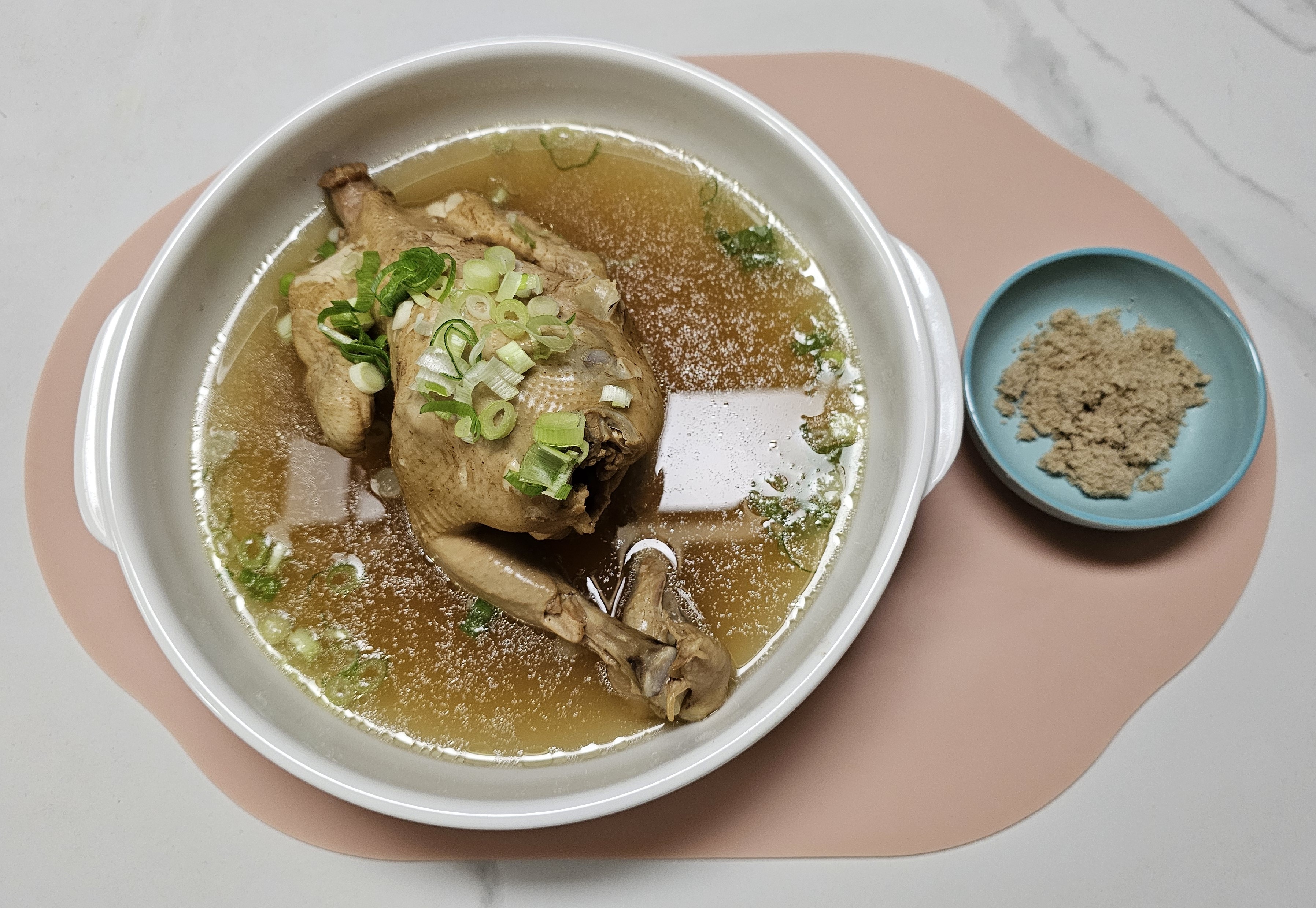 살이 부드럽고 부서지지않고 촉촉하게 잘 익었으면 넓은 그릇에 닭을 담고 국물을 넣은 후 쪽파를 송송 썰어 올려주면 첫 번째 삼계탕이 완성이다.