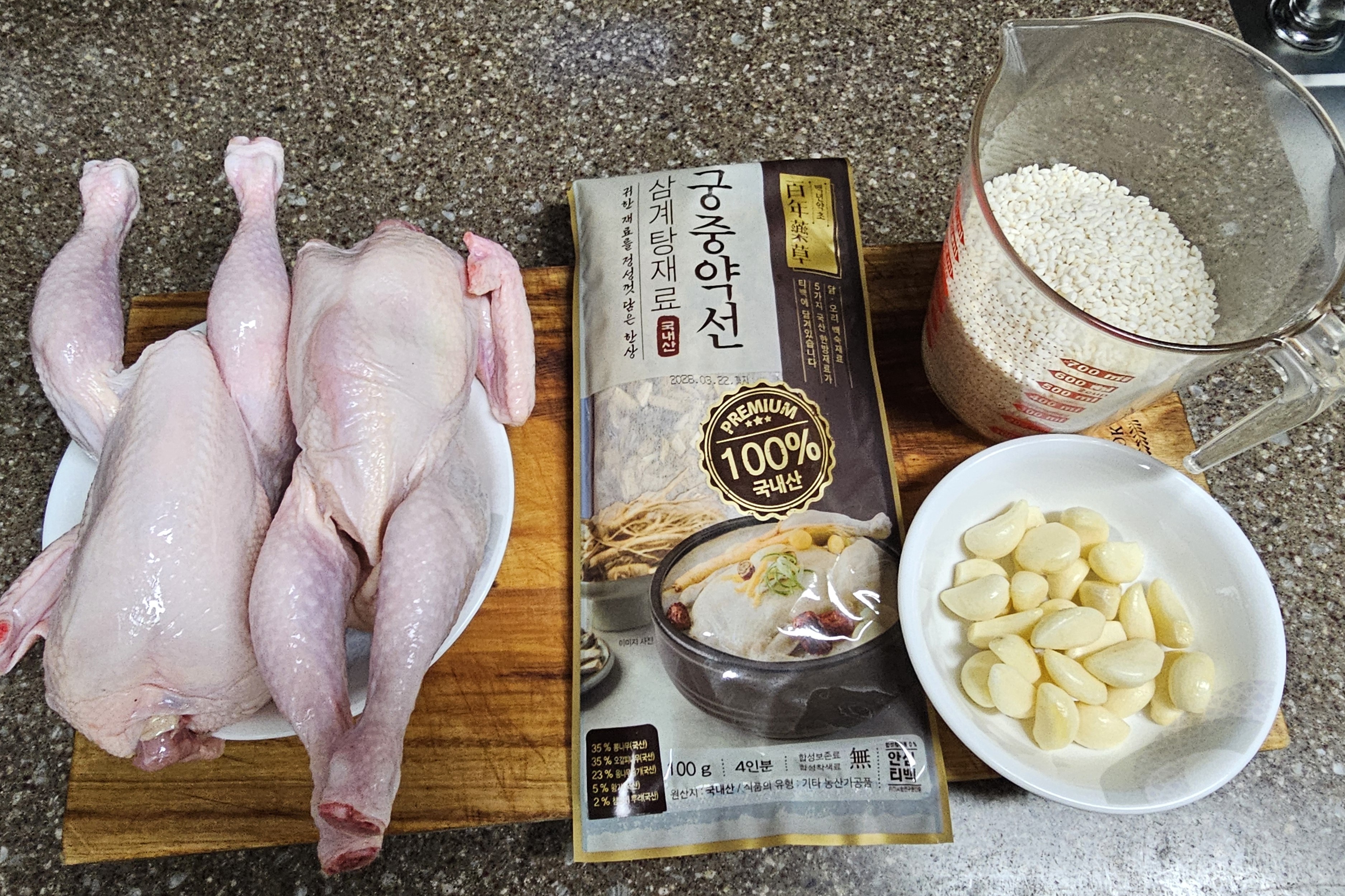 삼계용어린닭6호2마리, 시판용 삼계탕한방재료1팩, 찹쌀2컵, 물5리터, 통마늘 한줌, 쪽파, 소금, 후추