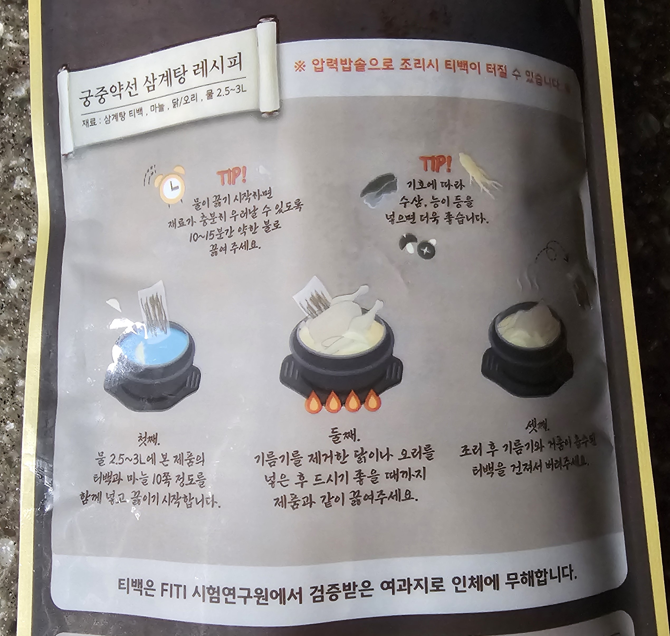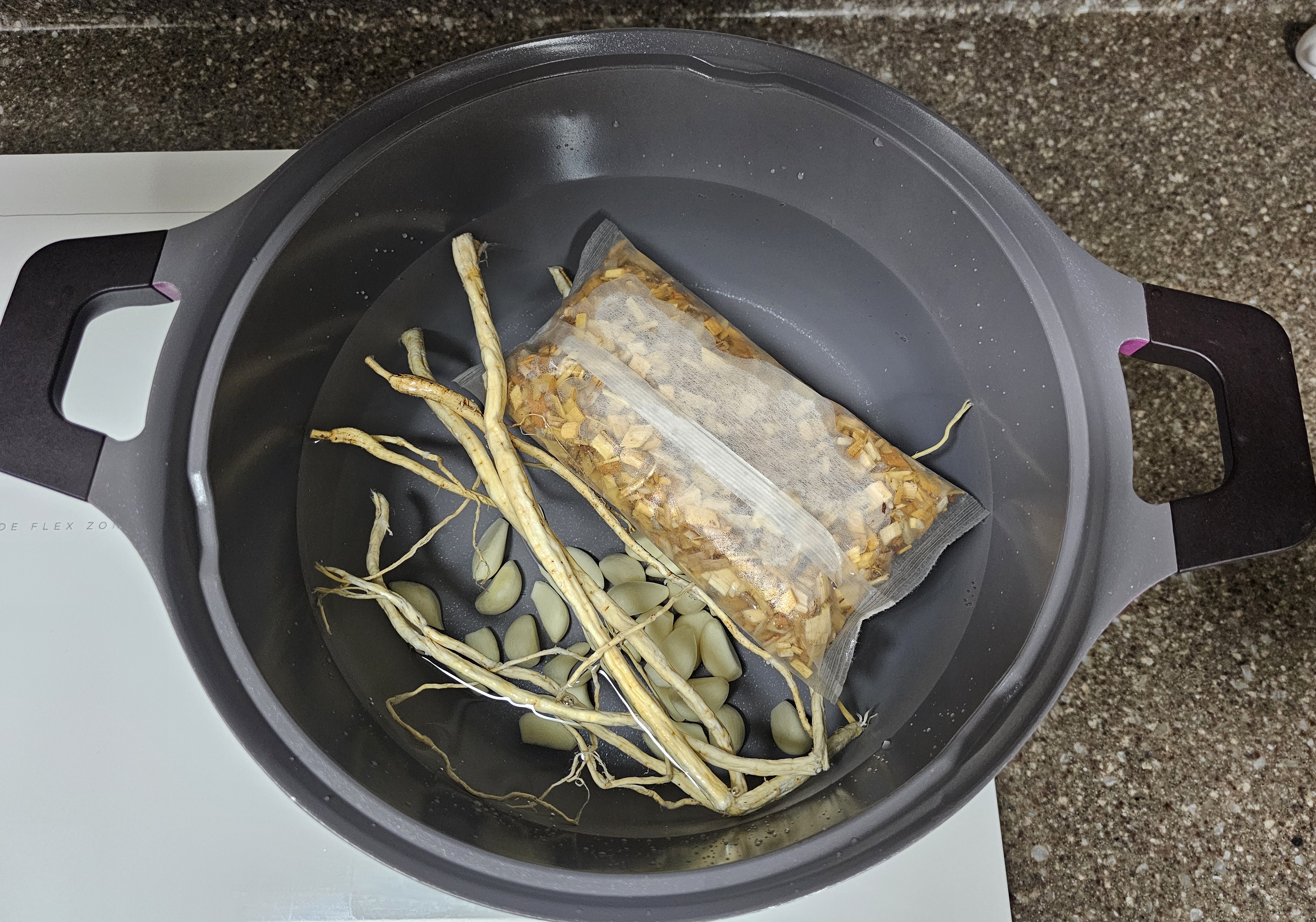 삼계탕에 들어가는 속재료도 간편하게 시판되는 한방삼계탕 재료모음 1팩을 넣을거다.
