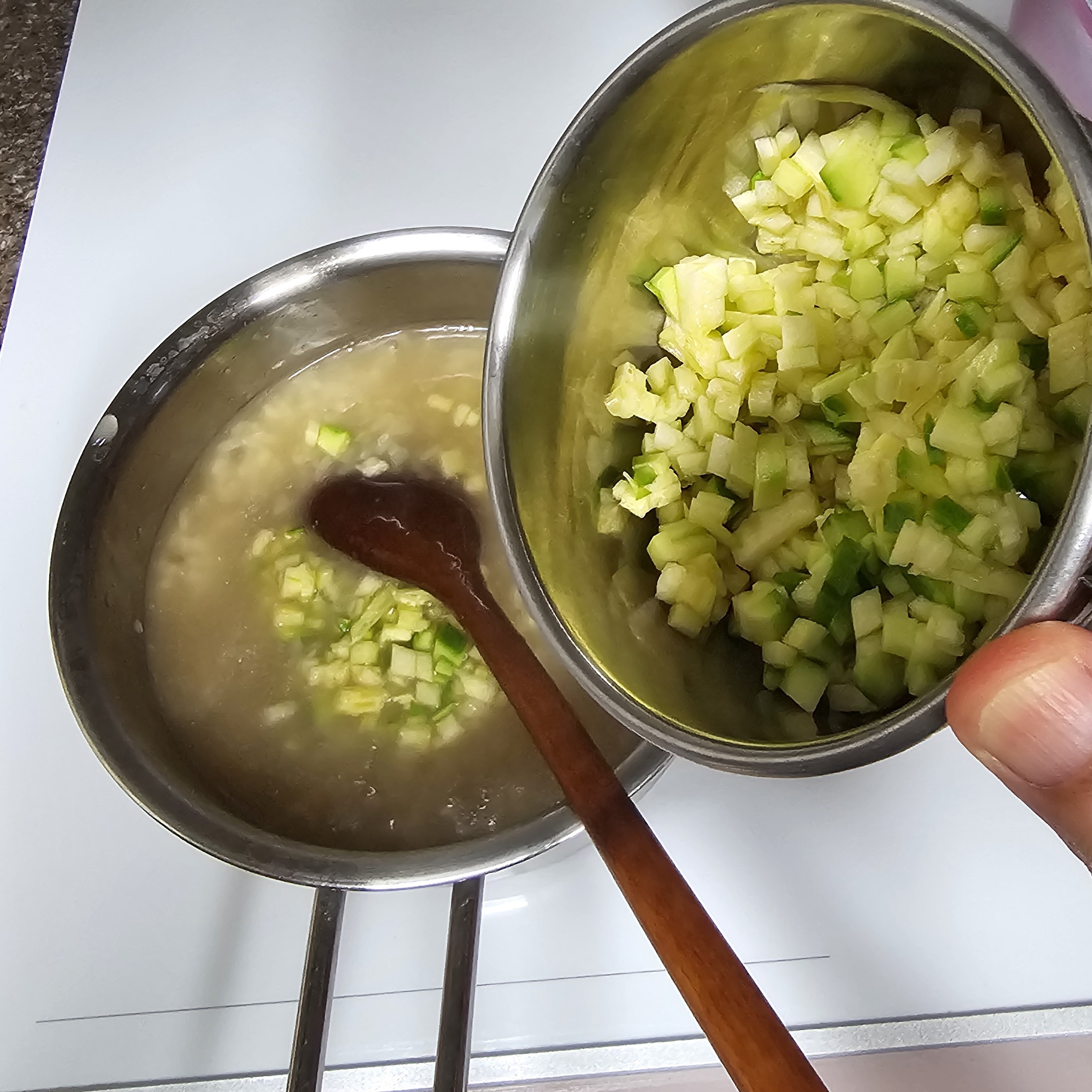 찹쌀이 퍼지기 시작하면 잘게 썰어놓은 야채를 넣는다.