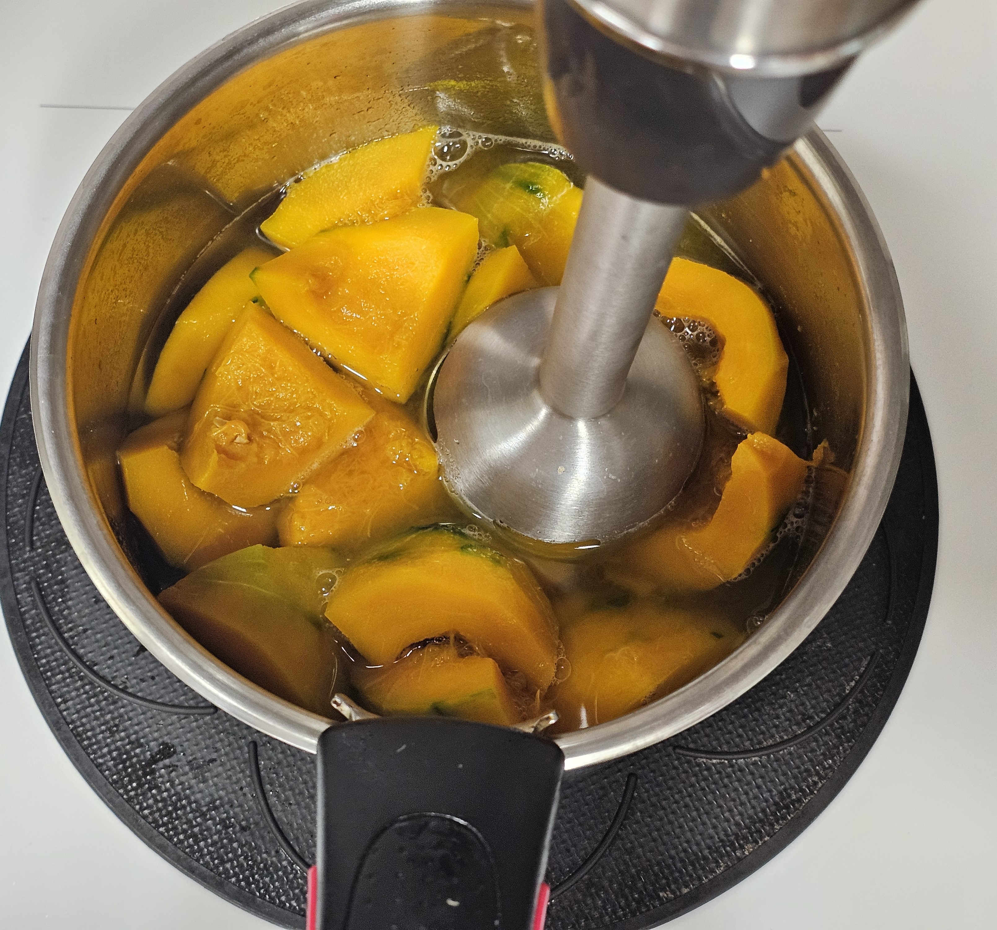 끓기 시작한 후 5분정도 있다 핸드 불렌더(도깨비 방망이)로 으깨준다.