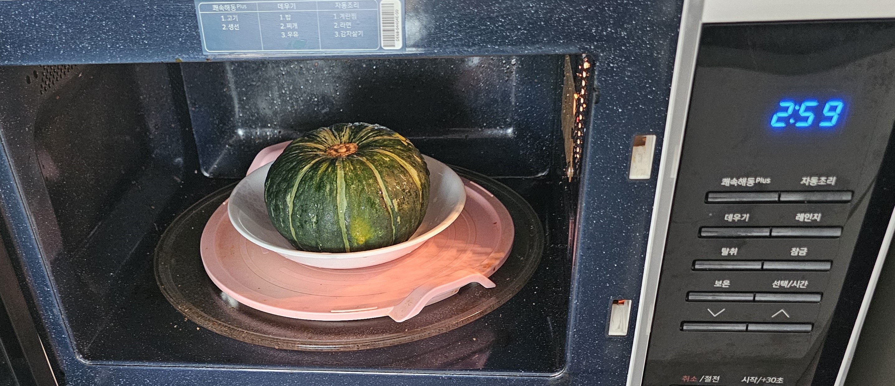 단호박을 깨끗이 씻은 뒤 전자레인지에 약 4~5분 정도 돌려준다.