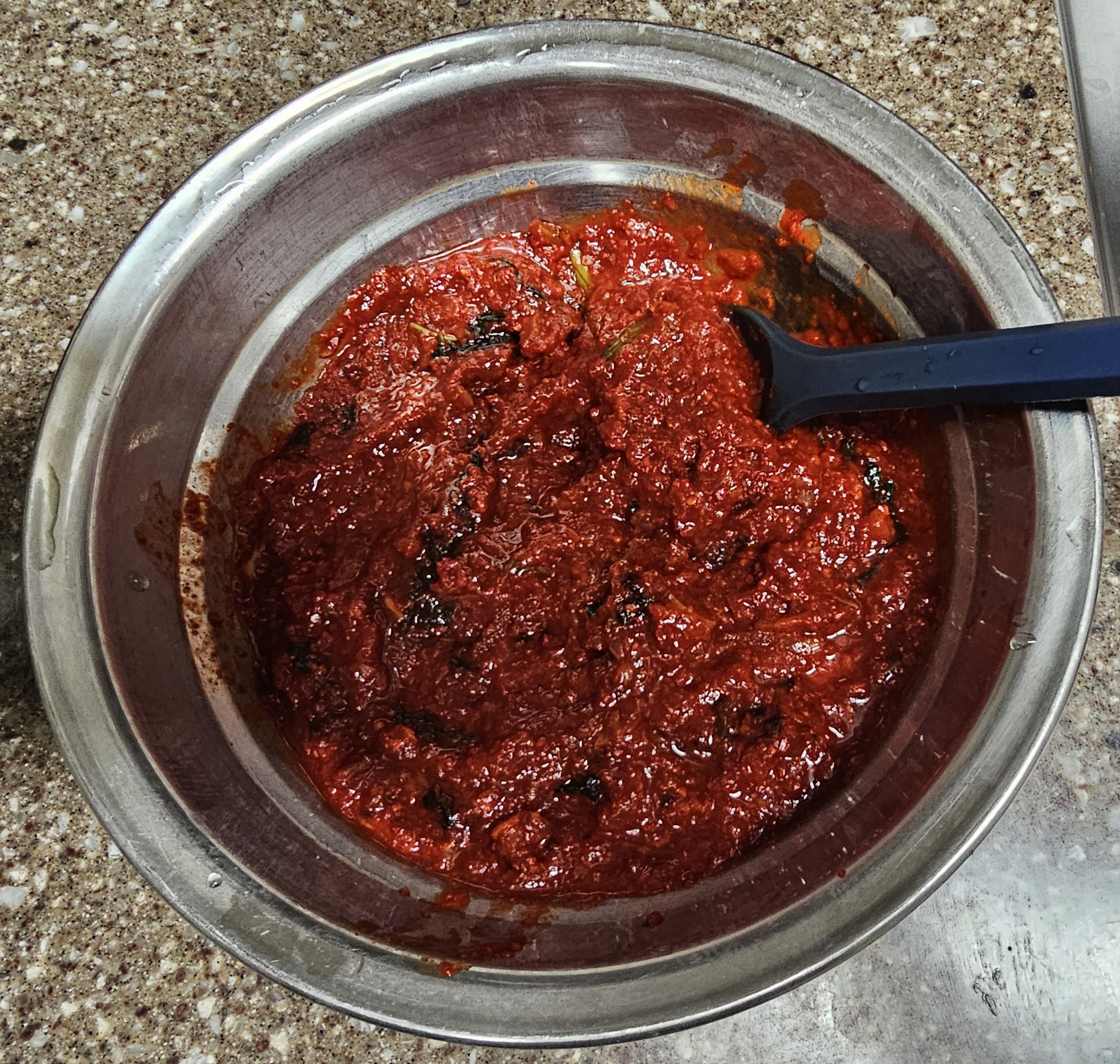 그릇에 분량의 양념(고춧가루, 액젓, 새우젓, 다진마늘, 생강, 매실청, 찹쌀풀)을 모두 넣고