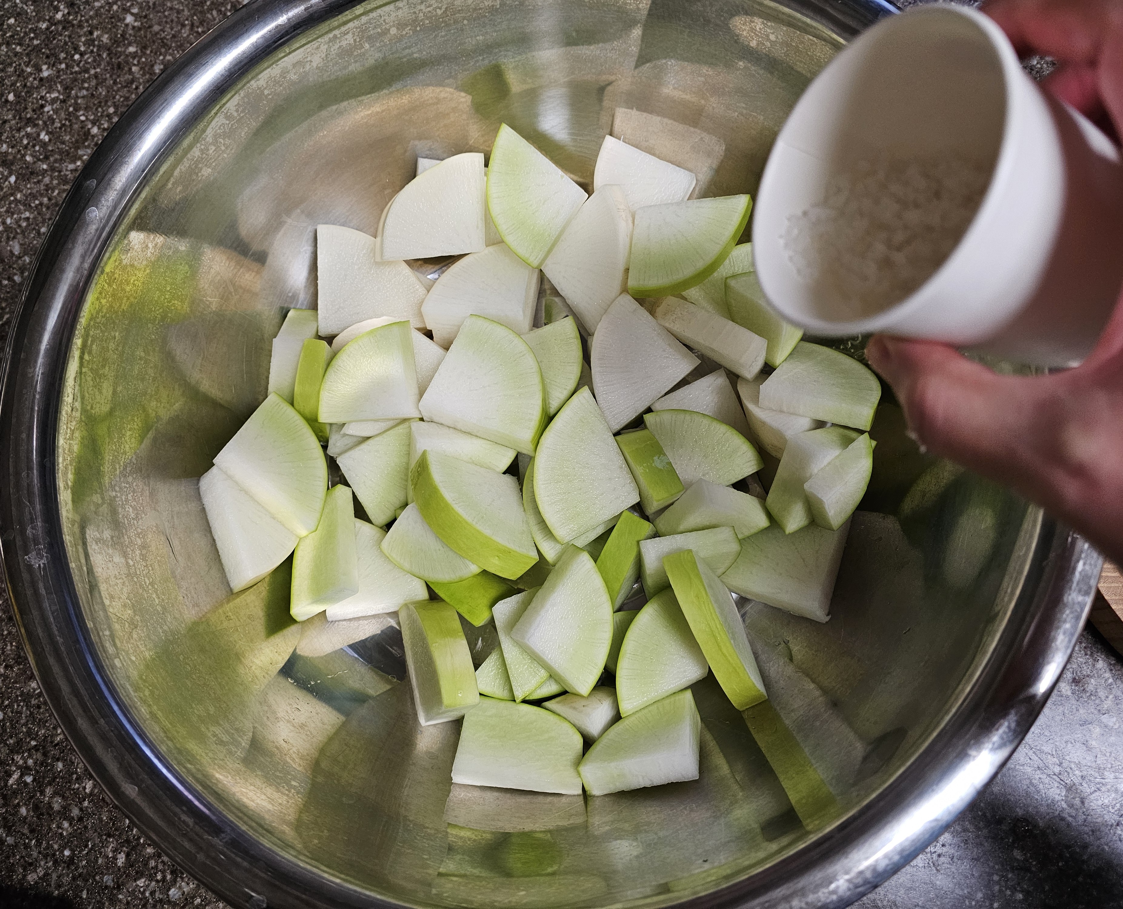 썰어놓은 무에 굵은소금(천일염)과 설탕1숟가락을 넣고 골고루 섞은 뒤 1시간 정도 절여줍니다.