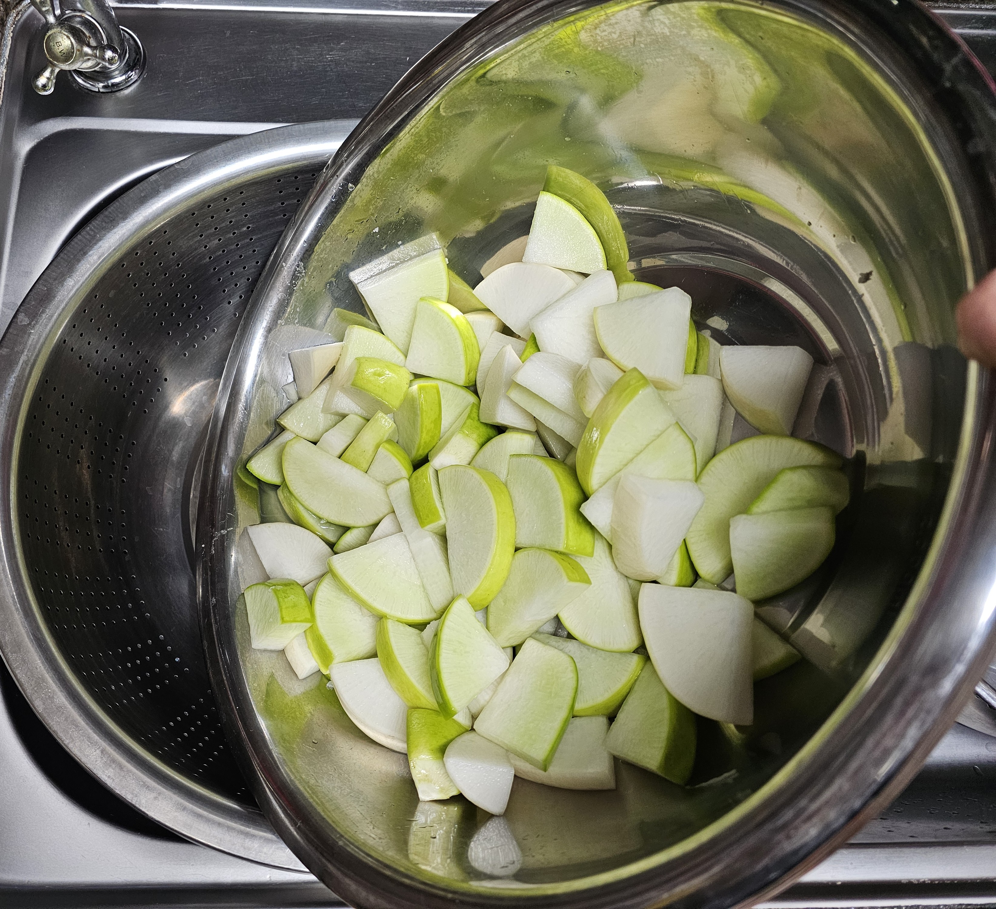 여름 무는 쓴맛이 강해서 좀 더 오래 절여주는게 좋습니다.(약 2시간정도)