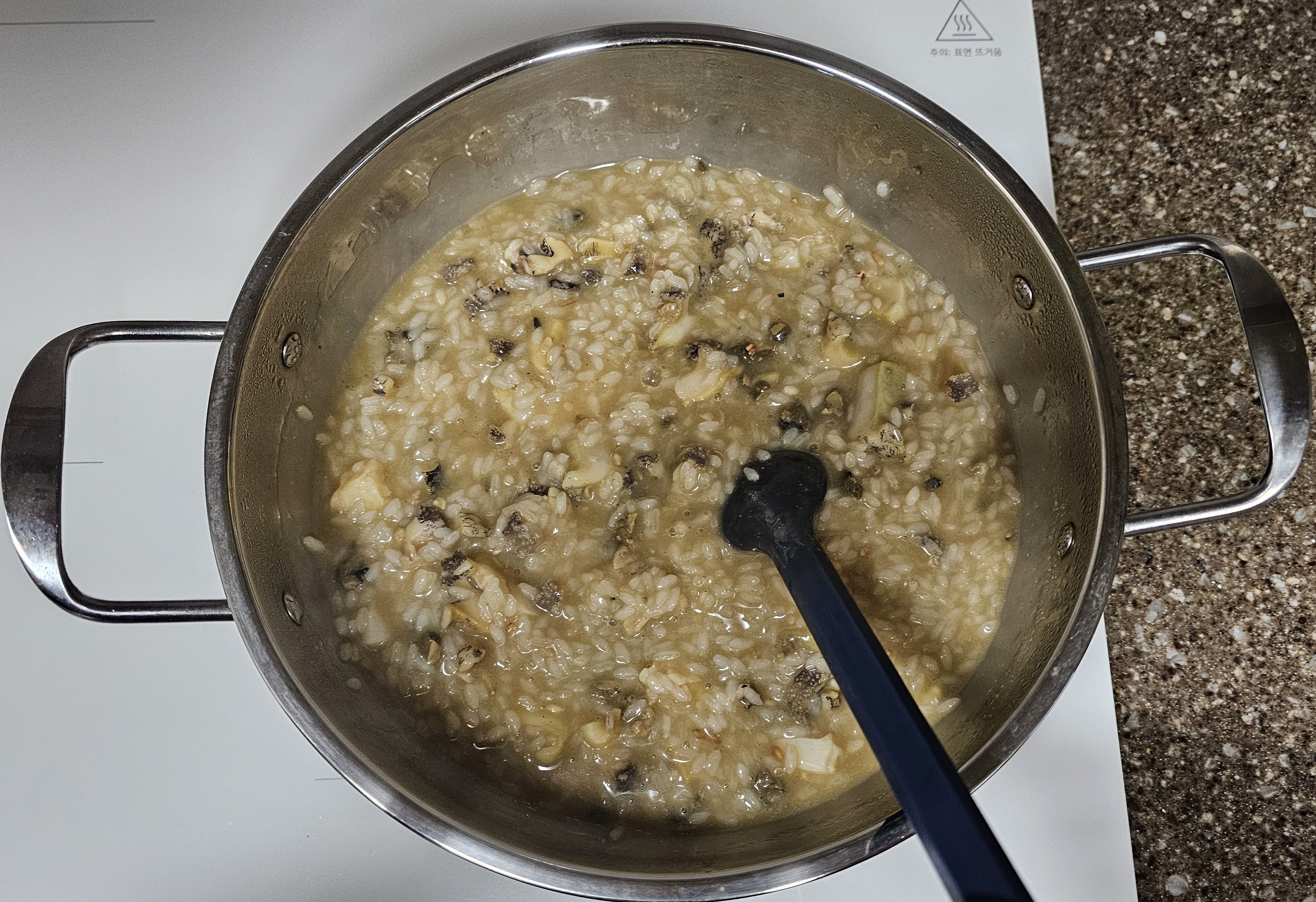 대략 15~20분간 중약불에서 쌀알이 완전히 퍼질 때까지 끓입니다.