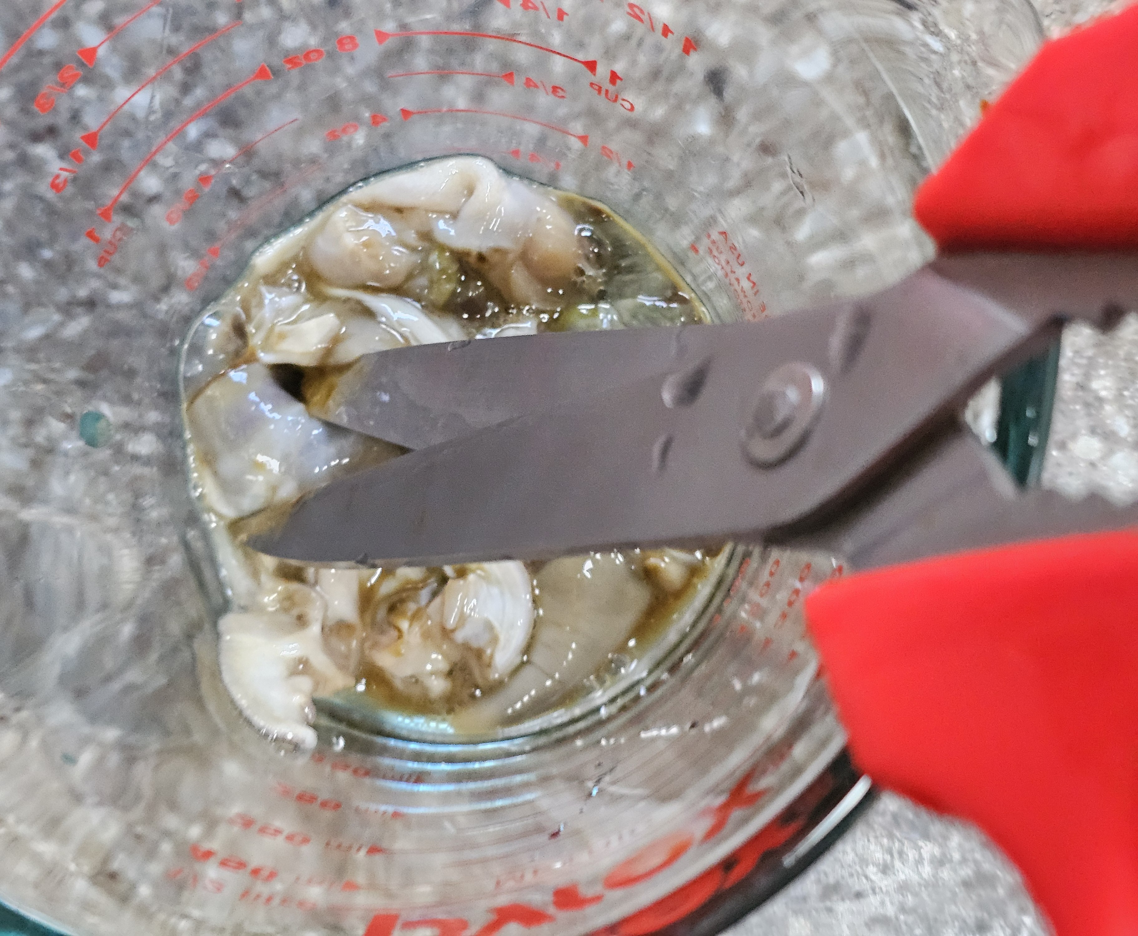 가위로 잘라내세요. 전복 내장 끝부분에 볼록하게 튀어나온 모래주머니도 잘라내면
