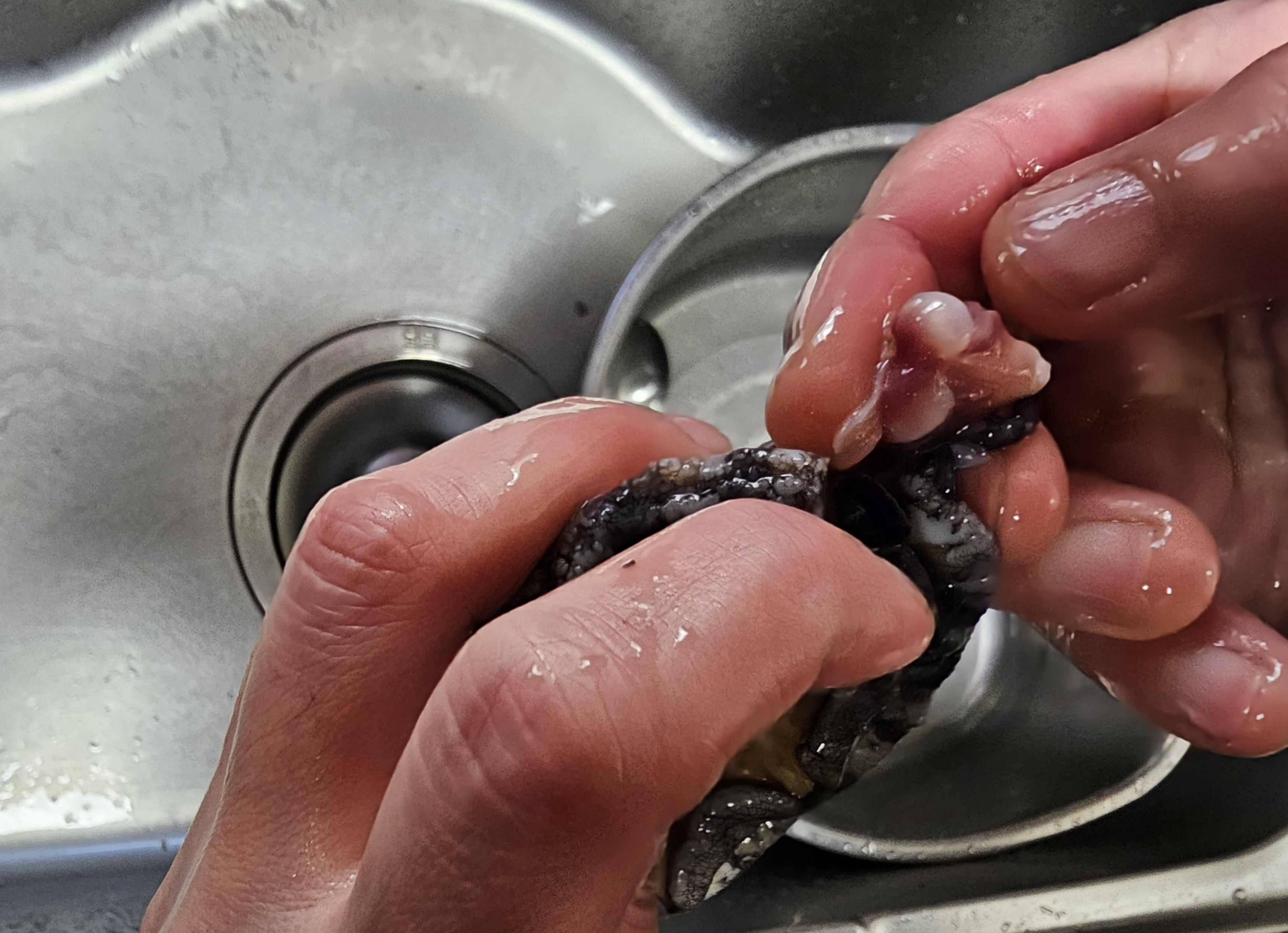 1. 세척: 주방용 전용 솔로 전복의 거뭇거뭇한 부분을 솔로 구석구석 문지러 주세요. 측면의 주름진 부분을 신경 써서 닦아주세요.