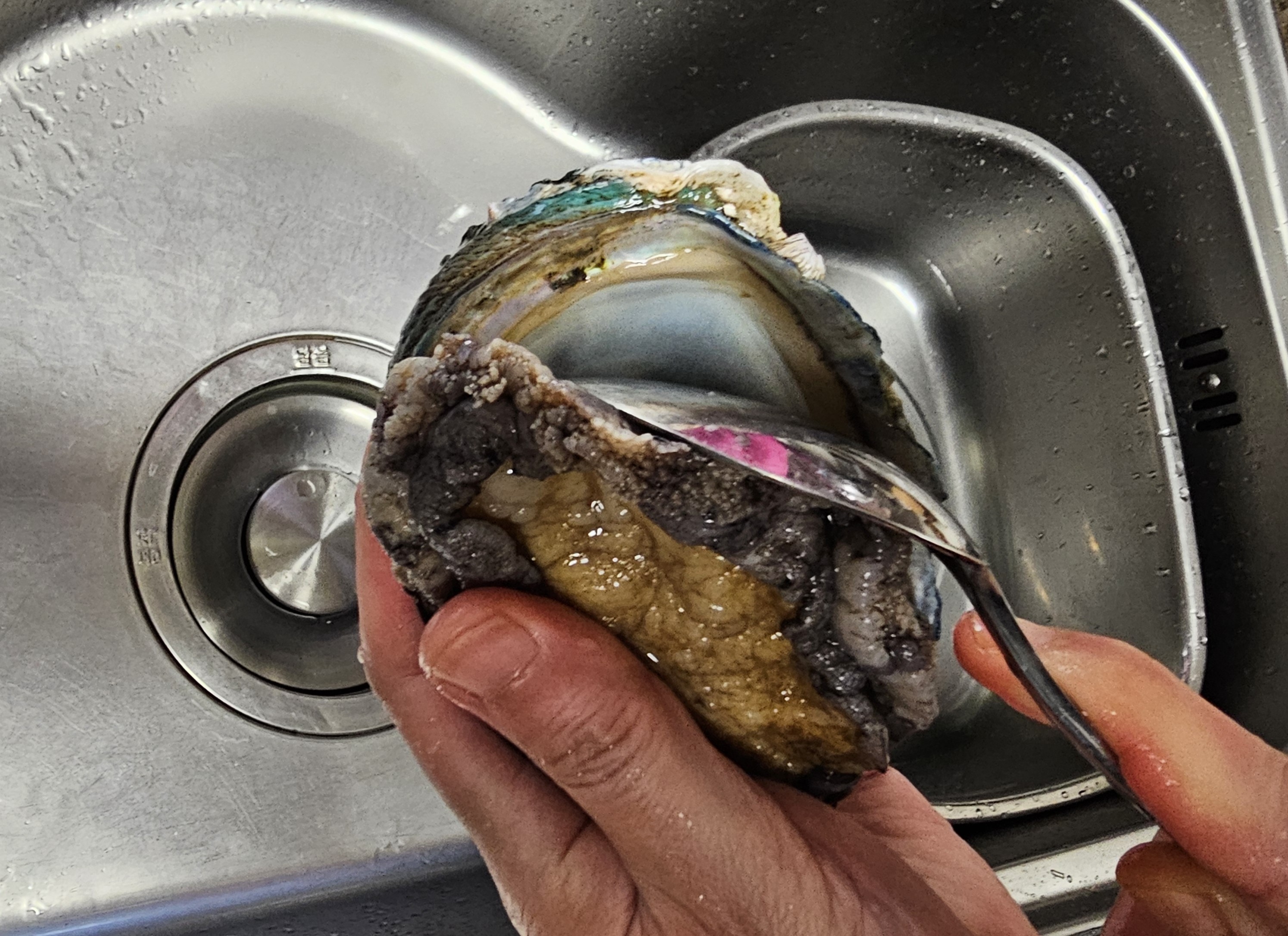 3. 제거: 전복 머리 쪽에 만져지는 딱딱한 이빨과 식도는 비린내와 세균의 원인이니 칼이나