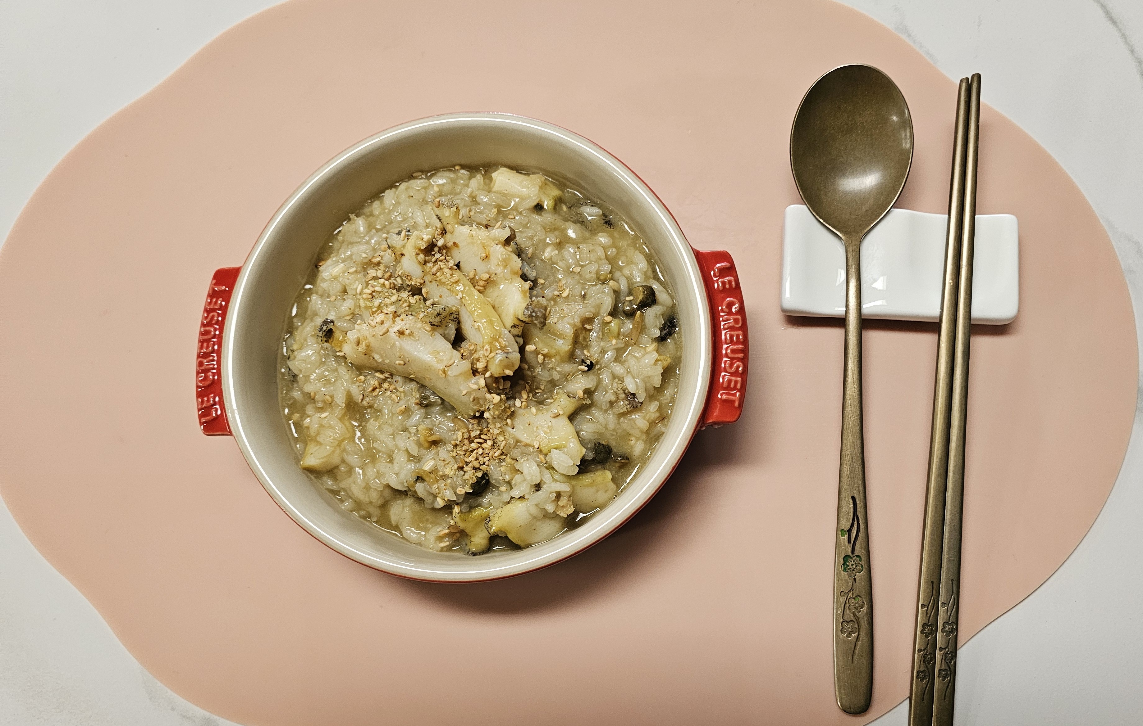 전복 3마리, 불린쌀 3~4컵, 물(쌀의 6배), 참기름, 국간장or참치액젓, 소금 약간, 깨소금
